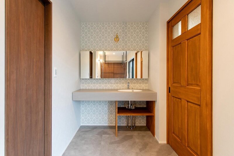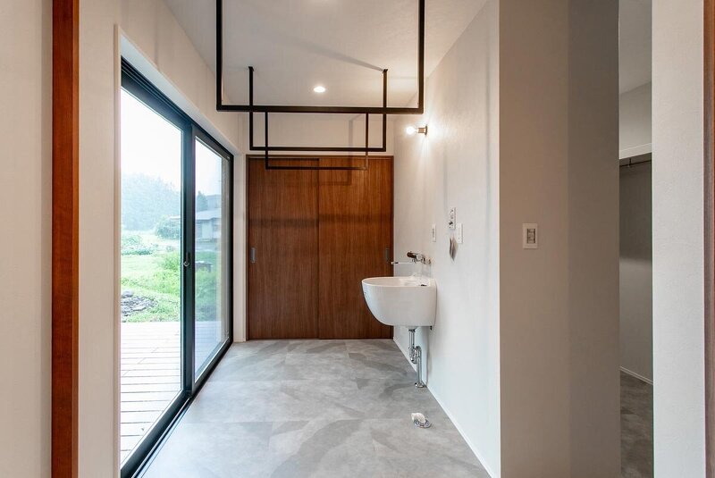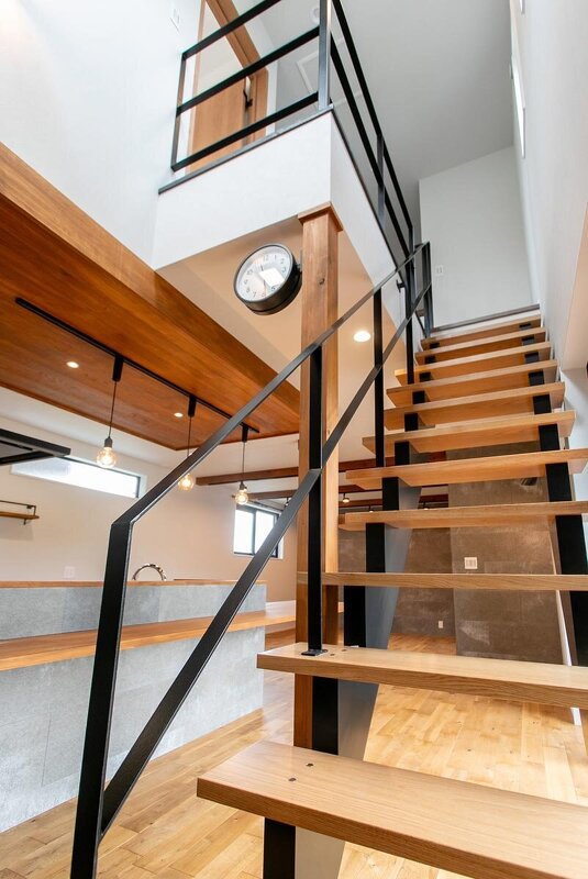 好きを詰め込んだ、木部の映えるリビング。カウンターテーブルを造作し一体感のあるダイニングに。アイアンやカップボードも弊社オリジナルで製作。屋根・外壁はガルバリウムでメンテナンス性能も高い。4畳のランドリースペースには、スロップシンク付きで使い勝手の良い家事スペースを実現。