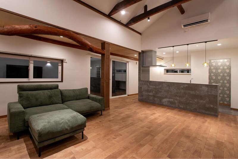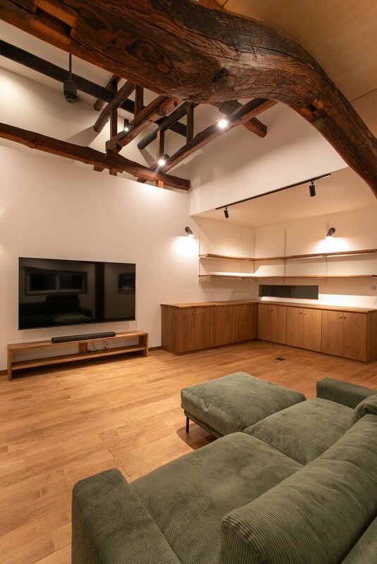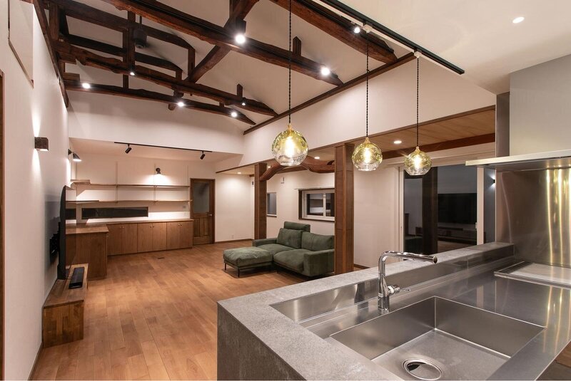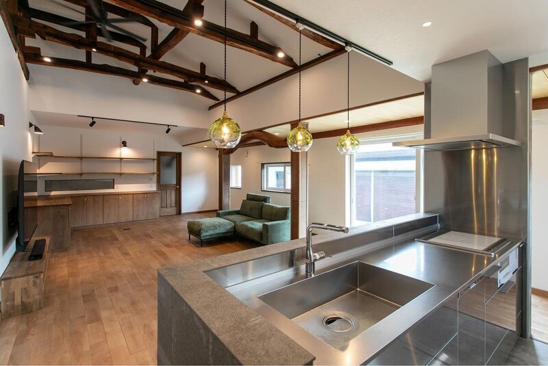 築60年の歴史ある古民家を再生した事例。折り重なるように配された特徴的な梁を活かし、開放的なリビングをつくりあげることでダイナミックでインパクトのある空間を形成。床はオーク材、造作で仕上げた家具には植物をディスプレイ。扉付きのため収納力も抜群。キッチンはステンレスだがリビングから見ると石張りと二つの顔を見せる。
