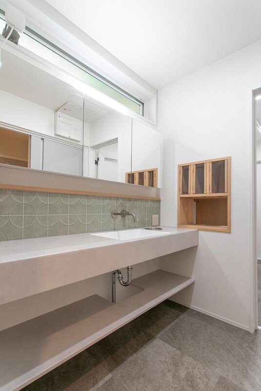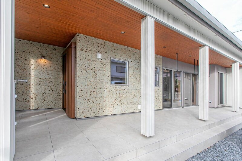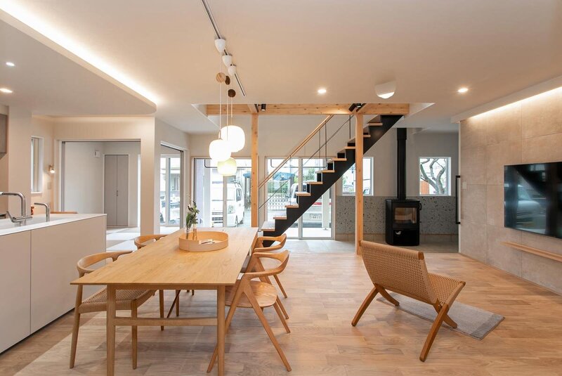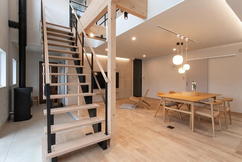 ナチュラルな色合いでまとめたLDKは何と言ってもその空間演出が特徴的。玄関から続く形で配された土間は吹き抜けも相まって開放的で伸びやかな空間づくりに貢献。屋外へのアクセスもスムーズにしてくれる。また、リビングに配したスケルトン階段も住まいの表情を大きく変えてくれる存在。家族のコミュニケーションをつくる場にもなる。
