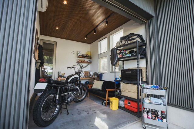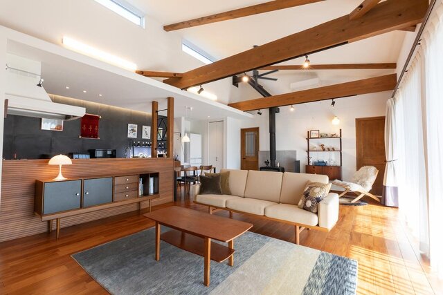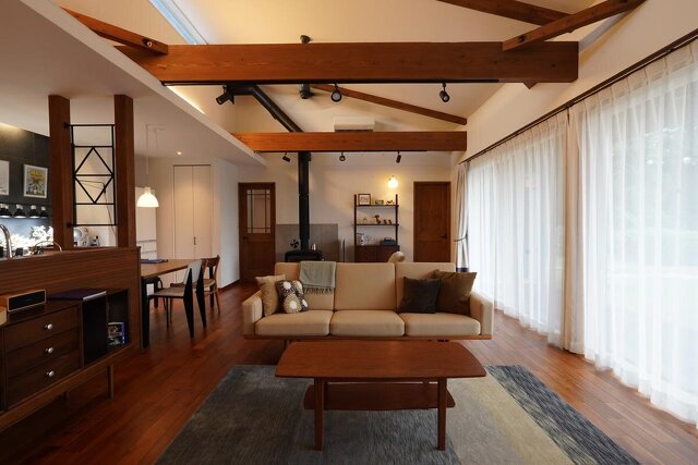ナチュラル、平屋、大黒柱・梁の現し、吹き抜け、ガレージ、薪ストーブ・ペレットストーブ