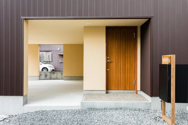 道路側からは見えない玄関ドア。ガレージとの一体感があり、雨の日も濡れずスムーズに移動できる。