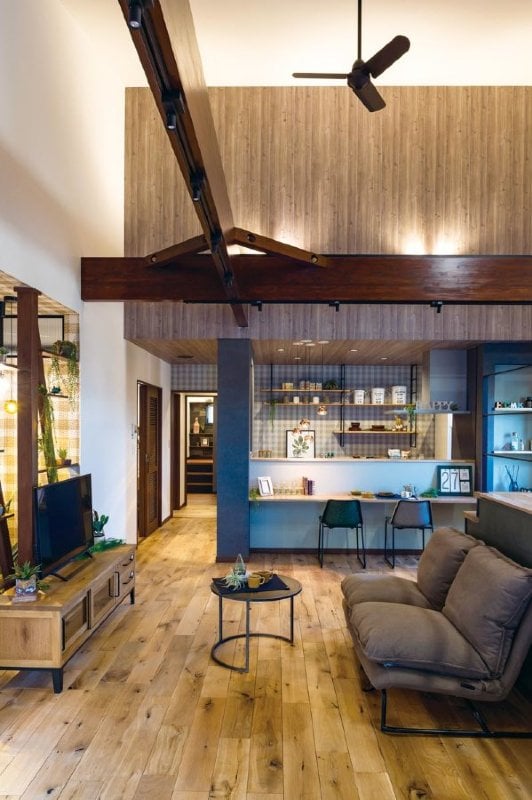 カッコ良さと温もりを併せ持った「モダンナチュラル」。カフェのようなチェック柄の壁紙や好みの食器が並ぶキッチンに、周囲との距離感を重視したダイニングカウンター。