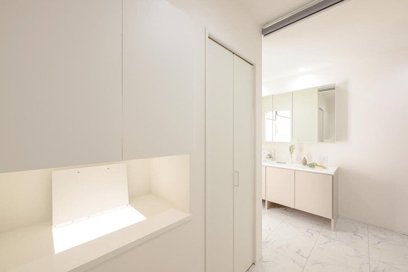 注目は扉を開ければ双方からタオルなどを出し入れできて、さらに脱衣室のシューターに脱いだ衣類を落とすと、ランドリールーム側から取り出せる仕組みの「便利棚」。