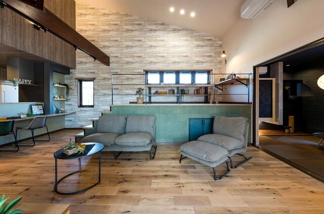 室内に入ると、勾配天井のリビングが広がり、平屋とは思えない開放感を演出。伊勢崎モデルハウスでも好評のスキップフロアを取り入れ、空間に奥行きと遊び心を加えました。