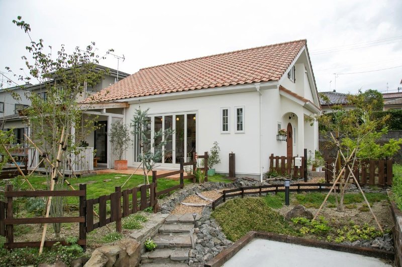 オレンジの洋瓦の屋根と真っ白な塗り壁が特徴の外観。カントリーのような木柵に囲まれていて、孫の「ひつじを飼っているみたい」の一言から「ひつじの家」とネーミング。