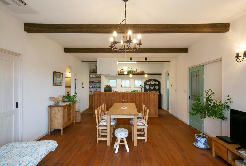 漆喰や無垢の木など、自然素材と手づくりのぬくもりに包まれた住まい。床には、幅広のレッドポールパインを採用。照明やドアのカラーにもこだわりが光る。