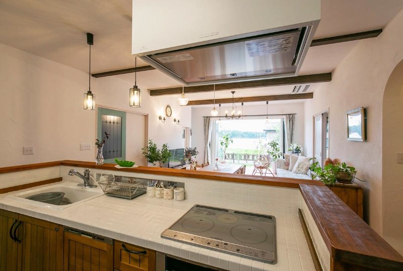 平屋をベースにした、オレンジの洋瓦に真っ白な漆喰の塗り壁のかわいらしいKさん宅。コレクションのアンティーク食器や雑貨をディスプレイする飾り棚や目の前に広がる海を独り占めできる大開口、開放感をもたらすインナーテラスなど「好きなものに囲まれて暮らしたい」というKさんの夢をカタチに。回遊動線で家事もしやすくプランニングした。