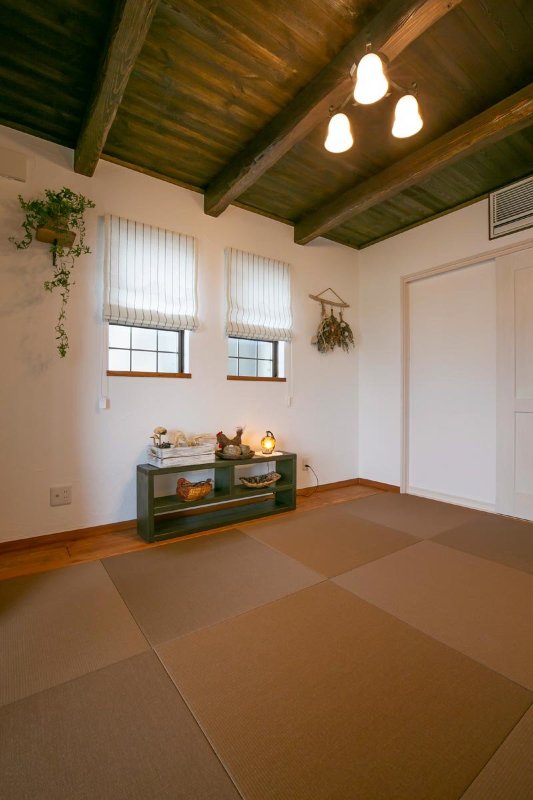 山小屋をイメージした和室。化粧梁と天井板はえぐり加工などを施し、ヴィンテージ風の味わいを演出した。