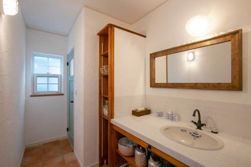 造作の洗面の天板には、キッチンとおそろいのタイルを。浴室の水色の扉がキュート。
