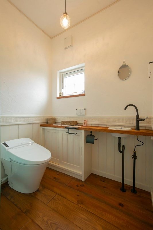 ゆったりとしたトイレは、腰板の上にモザイクタイルを施しアクセントにした。