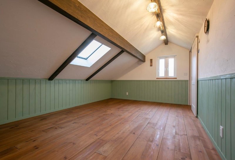 天窓からたっぷりと光が取り込める小屋裏。グリーンの腰板がかわいくておしゃれ。書斎や趣味の部屋など多目的に使える。