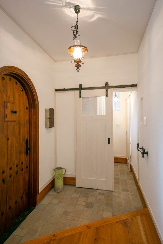 玄関の重厚感あるドアやシューズクローク(正面)扉の吊り金具は輸入建材、床には自然石を取り入れた。大容量のシューズクロークからもリビング行ける間取りになっている。