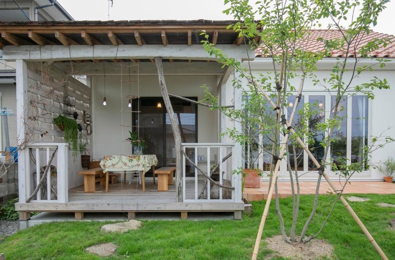 ティータイムを楽しめるウッドデッキ。屋根には手斧で割ったレッドシダーを施している。