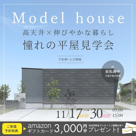 11/17(月)~30(日)の土日開催 【MODEL HOUSE】「高天井×伸びやかな暮らし 憧れの平屋見学会」 ※予約制