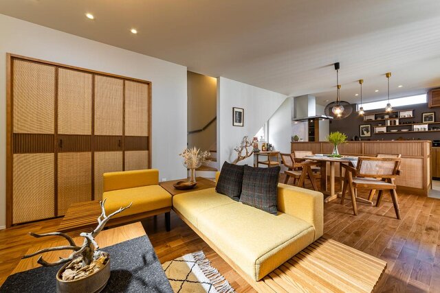 無垢床に加え、ラタンの建具や大谷石をあしらったアクセントウォールなど、自然素材のぬくもりと落ち着きが心地よい暮らしを生み出します。