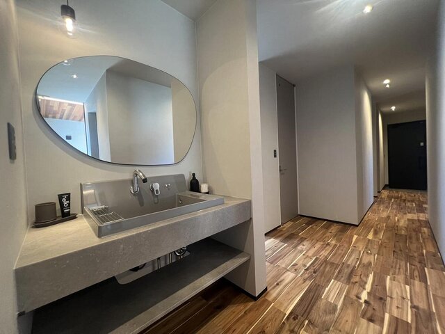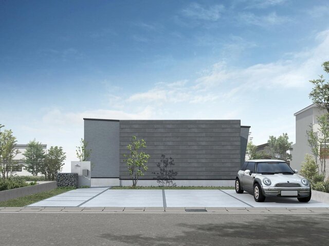 外壁にはドイツ漆喰「Sto」を採用。道路からの視線に配慮し、玄関前に重厚感のある目隠し壁を設置しています。
