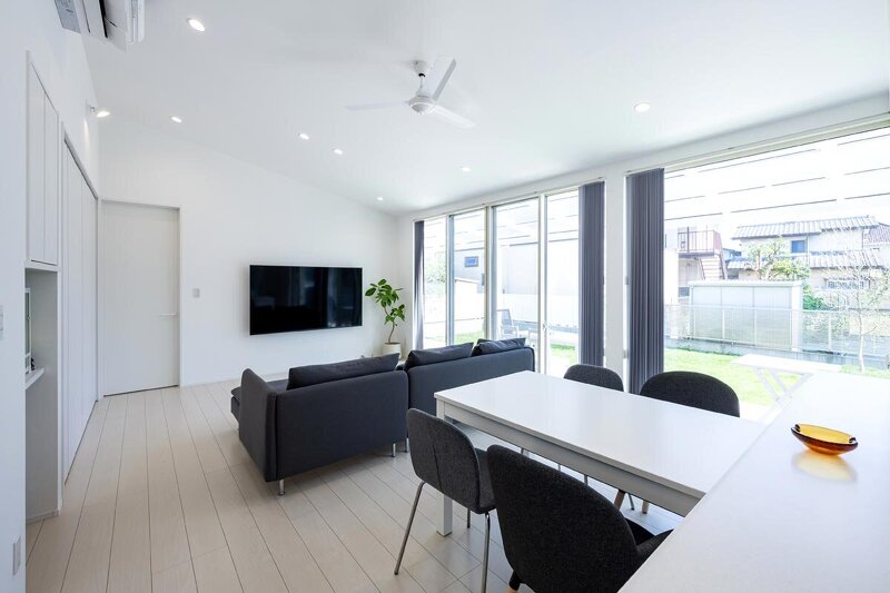 敷地面積を最大限活かし、Gさん夫婦念願のゆったりとしたサイズの平屋住宅を実現。デザインは、二人の好きな国ニュージーランドのビーチサイドをイメージした爽やかなデザインで統一。室内は回遊動線や、キッチンに設置した小窓により家事効率の向上にこだわった。屋根には太陽光パネルを搭載し、省エネルギーで快適空間を実現している。