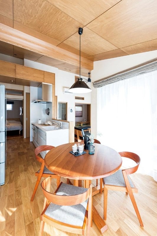 内外に「自然と家族みんなが集まりたくなる場所」が設けられている平屋の住まい。25年先という未来を見据え、無垢材・漆喰壁・珪藻土壁の健康素材やパッシブデザイン、そして実際に使える面積は44坪ながら、間取りを工夫することで登記上は35坪に抑えられる。これにより何年にも渡って支払い続ける固定資産税の負担も大きく軽減できる。