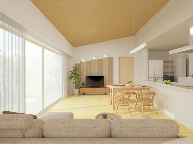 まぶしさを抑えた光に無垢の床と漆喰が合わさり空間全体をやさしく包み込みます。