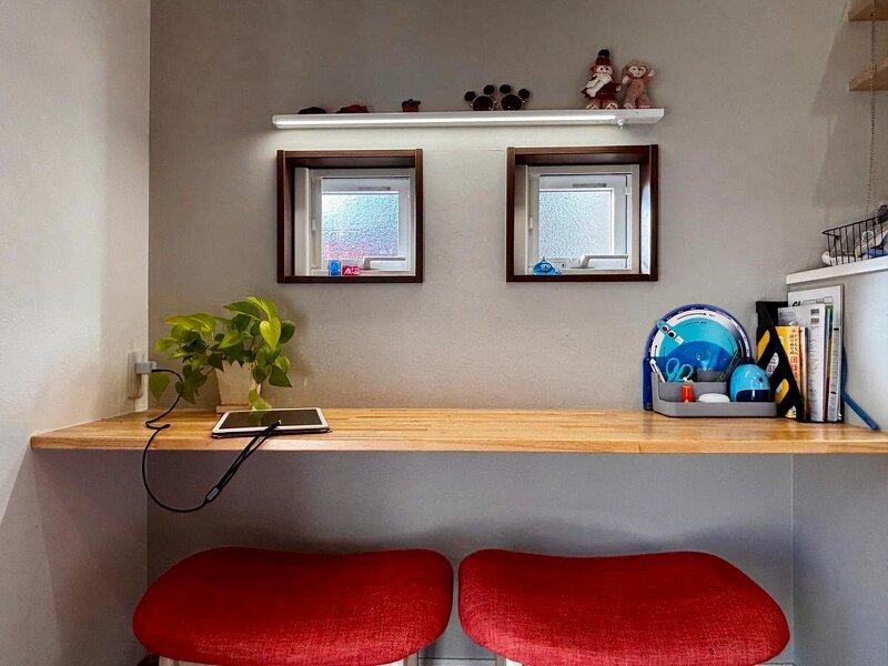キッチンの隣にあるスタディコーナーは、子どもたちの勉強に大活躍。親は料理や家事をしながら子どもたちの学習を見守れる。