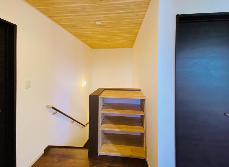 階段を上った先に、可動式の本棚を造作。アルバムや漫画など家族共有のアイテムをおける収納スペース。