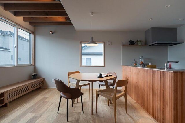 木のぬくもりを添える、リビング収納やテレビボード、カップボードなどの造作も必見だ。