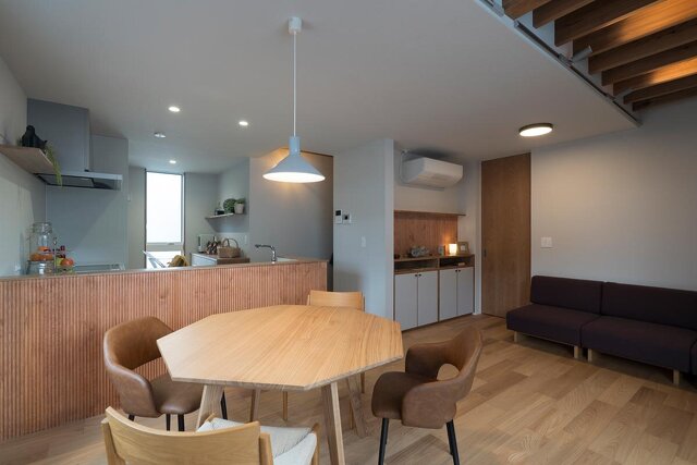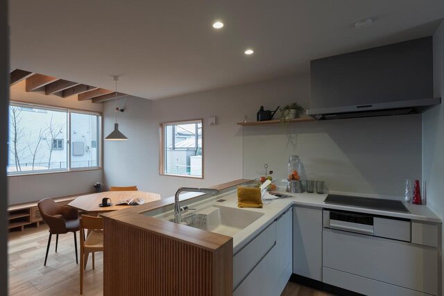短い動線で作業効率が良いL字型のキッチンを採用し、奥にはパントリーを備えすっきりと整理整頓ができる間取りに。