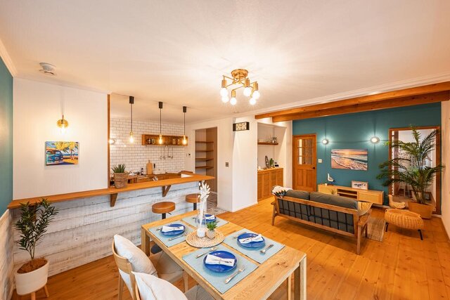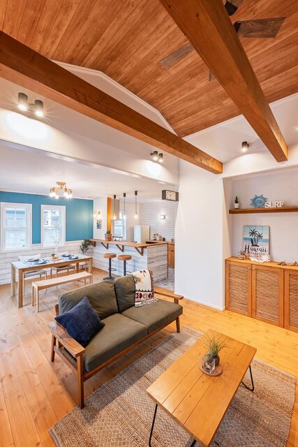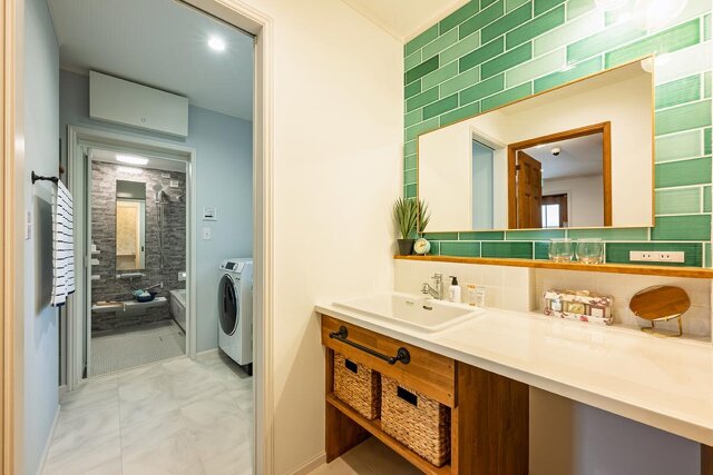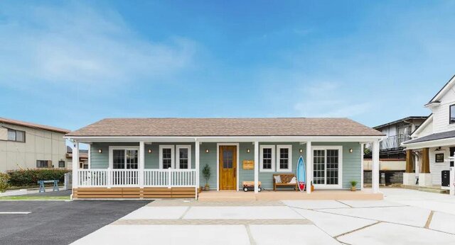 カバードポーチや統一感のある窓枠など、輸入住宅らしさを表現した個性的かつ爽やかな外観。邸内はやさしい肌触りの自然素材と、色鮮やかな西海岸テイストでデザイン。延床面積26坪の2LDKというコンパクトな設計は、「真似しやすい」と大好評!所々に素材を活かした造作にもぜひ注目してください!“他とは違う平屋”を求める方なら一度は見ておきたいモデルハウスとなっています!