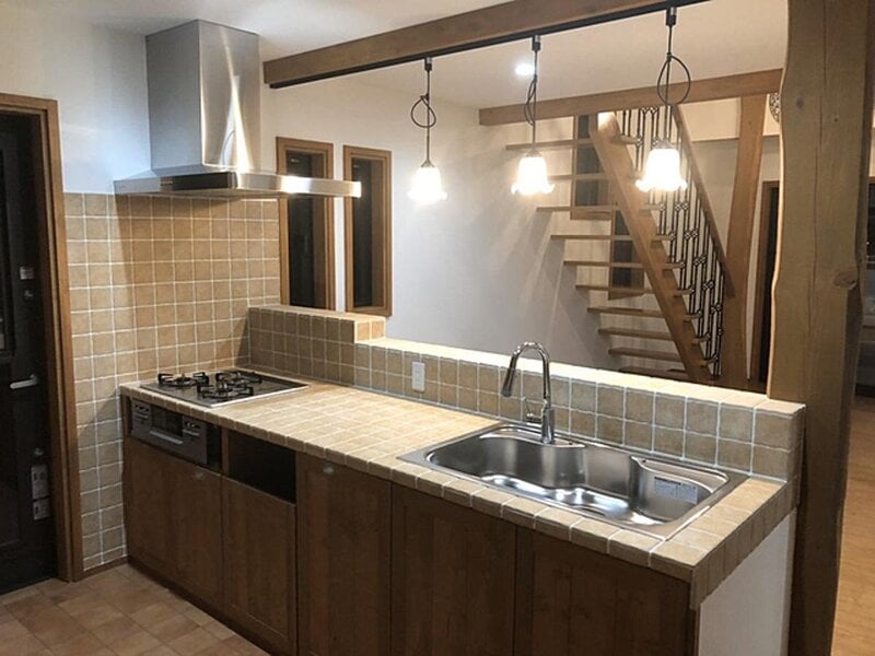 【after】以前は壁付けだったが、対面型の同社造作キッチンに。天板は奥様が大好きなかわいいベージュ色のタイルに。照明もこだわり、大満足なキッチンとなった。