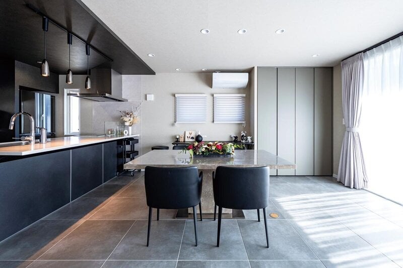 幅の広い600角のタイル床やスタイリッシュなデザインの階段、吹き抜けの開放感がご夫婦の理想としていた世界観を強調している。