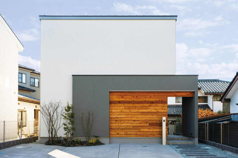 塗り壁と金属サイディングを組み合わせた、端正で上質な外観。板張りのアクセントが表情を添える。太陽光発電10.56kWを搭載し、省エネ性にも配慮した。