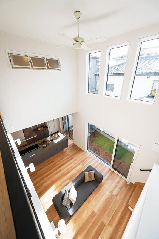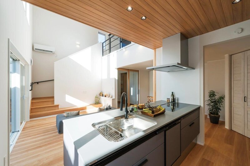 建物南側にライトコートを配し、吹き抜けを中心に光と風を巡らせたパッシブデザインの住まい。太陽のぬくもりやそよ風を感じながら、室内は一年を通して穏やかな空気に包まれる。太陽光発電を搭載し、長期優良住宅認定、耐震等級3・断熱等級6の高断熱高気密仕様を実現。GX志向型住宅基準にも適合し、家族が自然と集う心地よい日常を叶えた。
