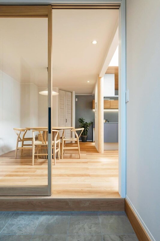 ガラス戸越しに奥まで見渡せる玄関。帰宅時や来客時も家族の気配が自然と伝わり、住まい全体のつながりを感じられる、開放感のある設え。