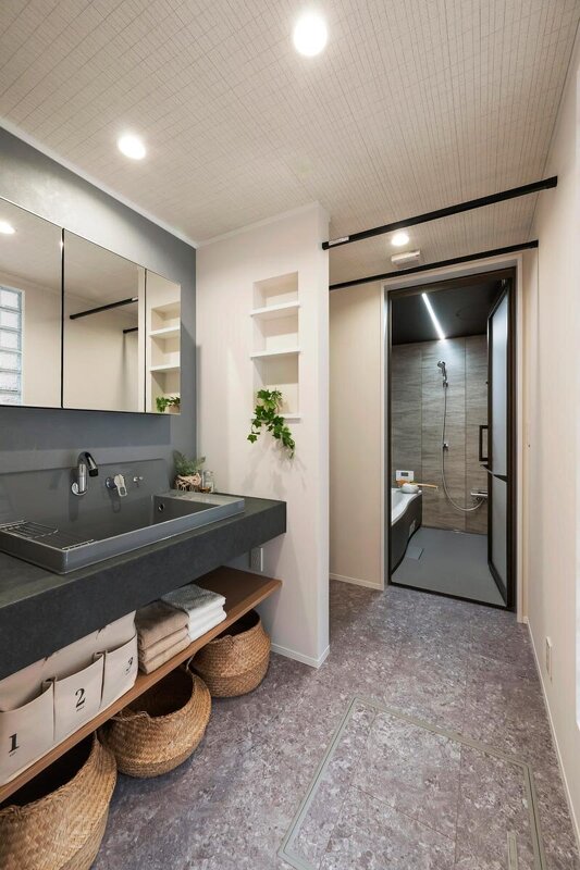 上質な洗面を備えたドライルーム。グレーと木の造作棚が調和し、意匠性と使いやすさを両立。アイアンバー付きで室内干しにも対応し、奥には浴室が続く。