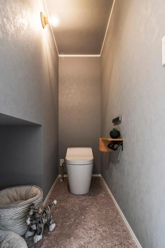 質感や色使いにこだわったトイレ空間。照明が生む陰影が落ち着いた雰囲気を演出する。左手前の開口は、ペット用トイレを想定したさりげない工夫。