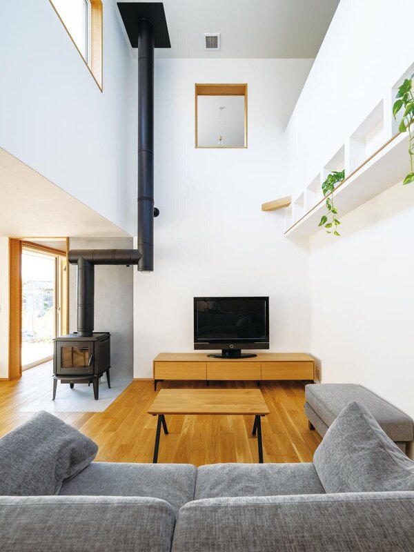 冬は揺らめく炎を眺めながら、ゆったりと寛げるリビング。薪ストーブの熱が吹き抜けを通じて家中に伝わり、高い断熱・気密性も相まって、朝までエアコン要らずで過ごせる。