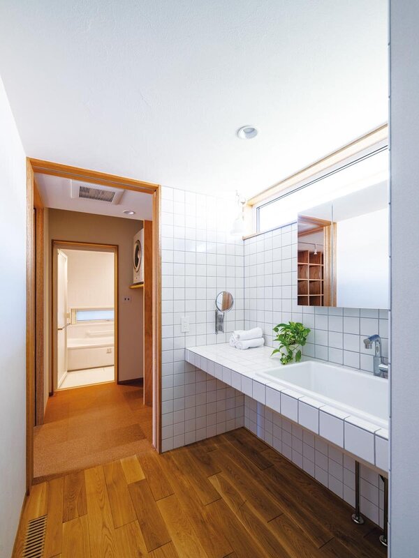 壁とワークトップに使用した正方形の真っ白なタイルと、大きな一体型のボウルが目を引く洗面化粧台。
