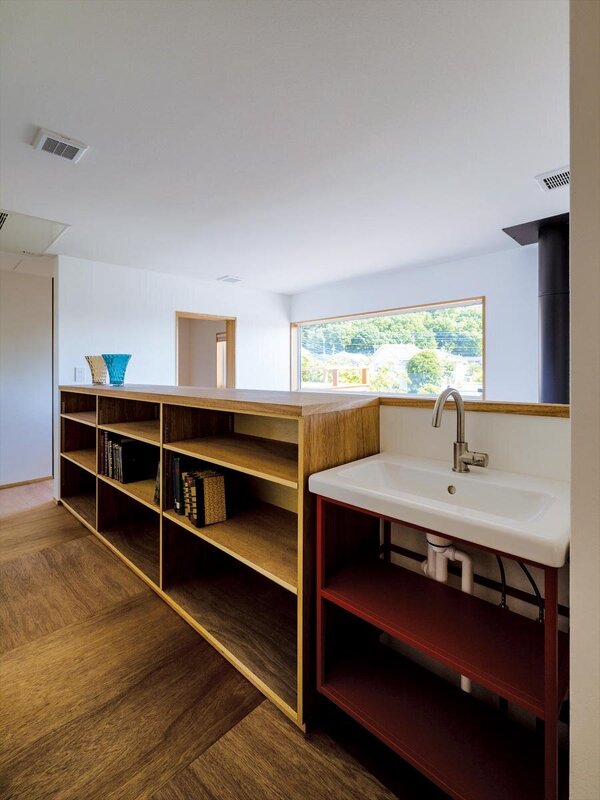 高窓から差し込む陽の光は、セカンドシンクと本棚を完備した2階ホールまで明るく照らす。