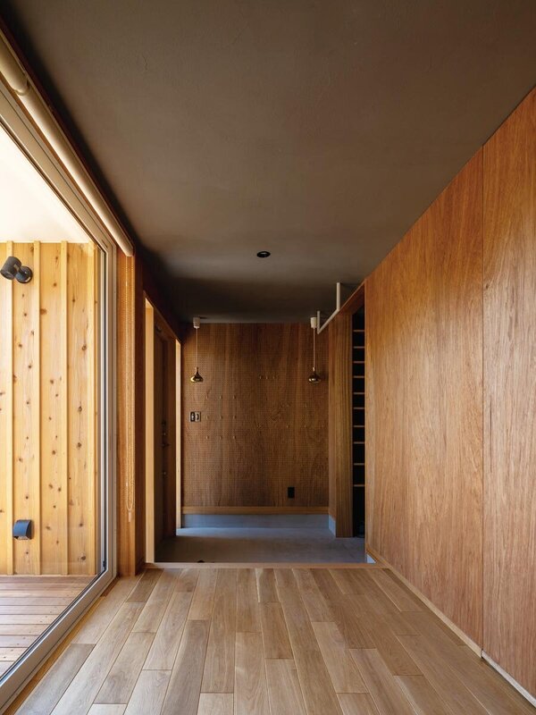 静謐さを感じさせる玄関ホール。ベニヤ板は実は隠し扉で、ウォークスルークローゼットへと続いていく。