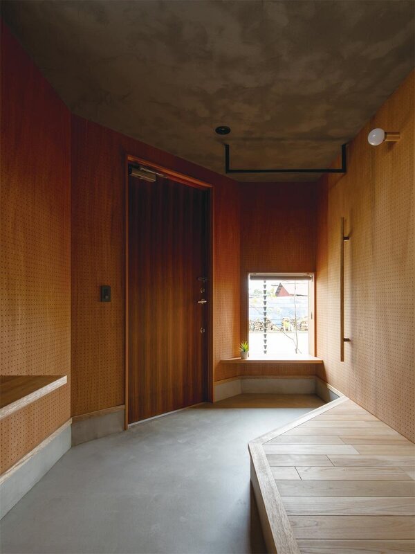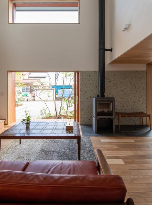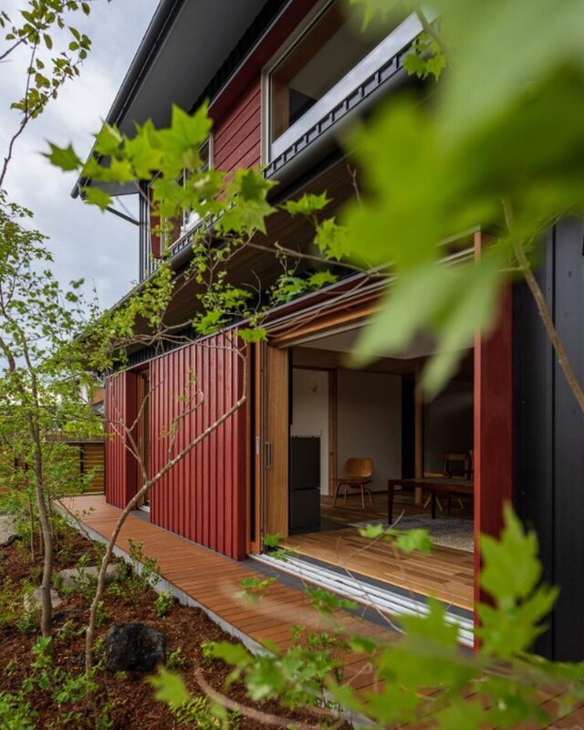 群栄建築舎が設計・施工した2棟の住まいが隣同士に並ぶ。一方はガルバリウム、ここで紹介する邸宅は黒と紅色の着色した杉板張り。どちらも「街の風景に馴染む」設計も心掛けている。邸内においても特にご主人こだわりの玄関空間ホールをはじめ、薪ストーブを中心としたリビング、木製サッシを採用した大開口、そして健康を意識した素材は必見。
