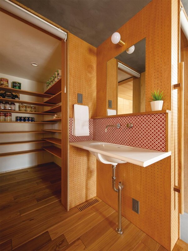 木製扉ならではの重厚感に加え、炭入り漆喰塗りの天井や有孔ボード。さらにパントリー→キッチンと続く動線は、奥様も大絶賛。