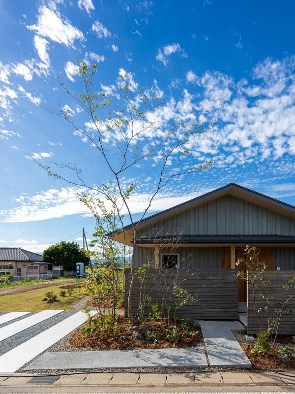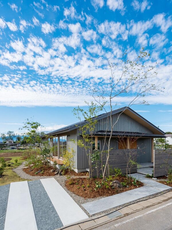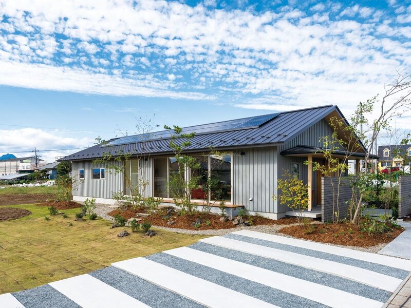 広大な敷地を活かした長方形の平屋。南向きの空間が増えるため、陽当たりは抜群。グレーに塗装した板張りの外壁も、爽やかな青空に溶け込んでしまうかのよう。