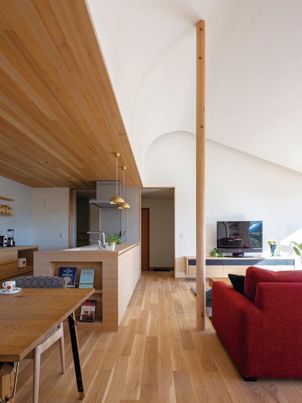北海道産の楢材を用いた床や漆喰の塗り壁といった選りすぐりの自然素材に加えて、アール天井に数々の造作家具など、同社の魅力が詰まったLDK。