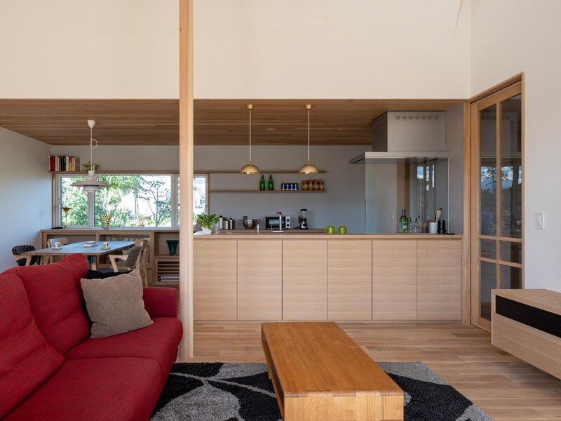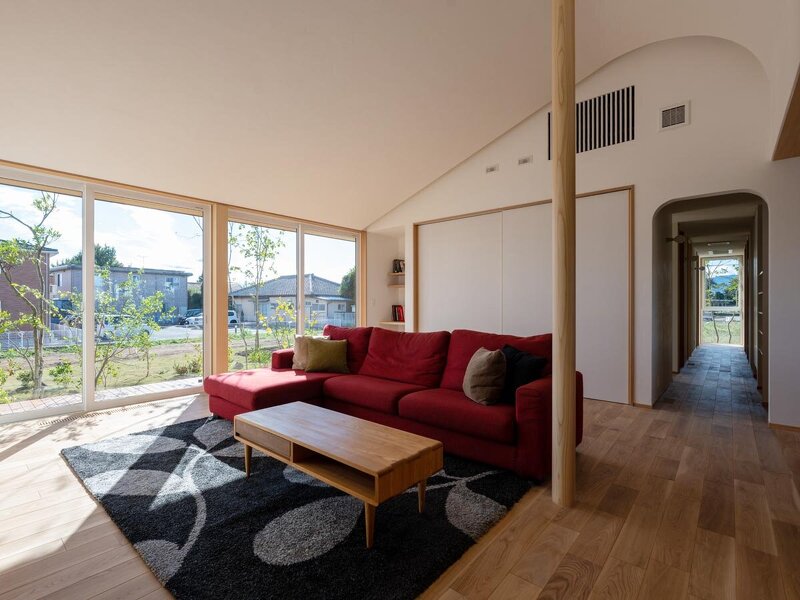 広大な敷地に建つ平屋の住まい。北側には雄大な赤城山を望める魅力的な環境を活かして窓をレイアウトするなど、「眺めの良さ」は抜群。また、群栄建築舎の大きな特徴でもある造園やリビングのアール天井、様々な造作家具も目を引く空間に仕上がっている。なお、空調はダクト式による小屋裏エアコン。「第6回日本エコハウス大賞」奨励賞受賞。