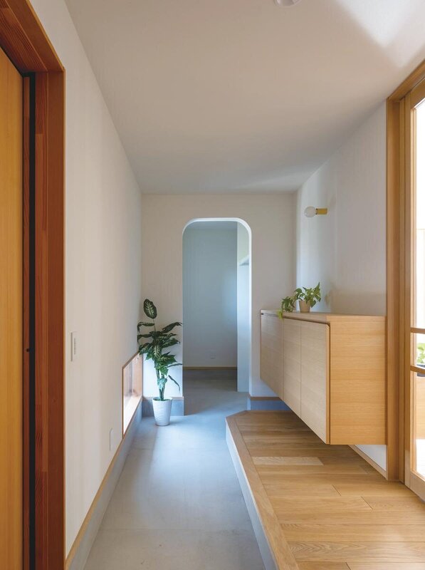 静謐な雰囲気を感じさせる玄関ホール。框部分が広いため、家族が同時に気持ちにゆとりを持って靴を脱ぎ履きできるだろう。