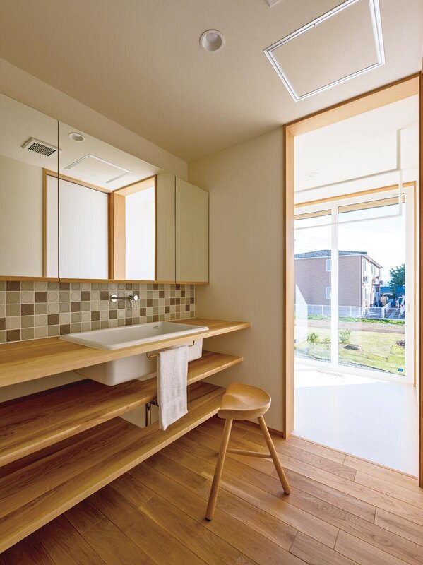シックなタイルが印象的な洗面脱衣室。さらにその南側には、掃き出し窓から陽の光が燦々と差し込むランドリールームが隣接している。