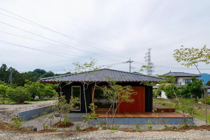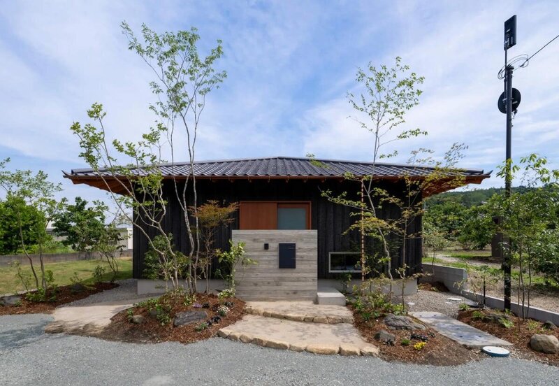 焼杉の外壁、銀古美の瓦で仕上げた寄棟屋根、張り出した軒が水平方向に広がっていくような、高さを抑えたプロポーションが魅力の外観。