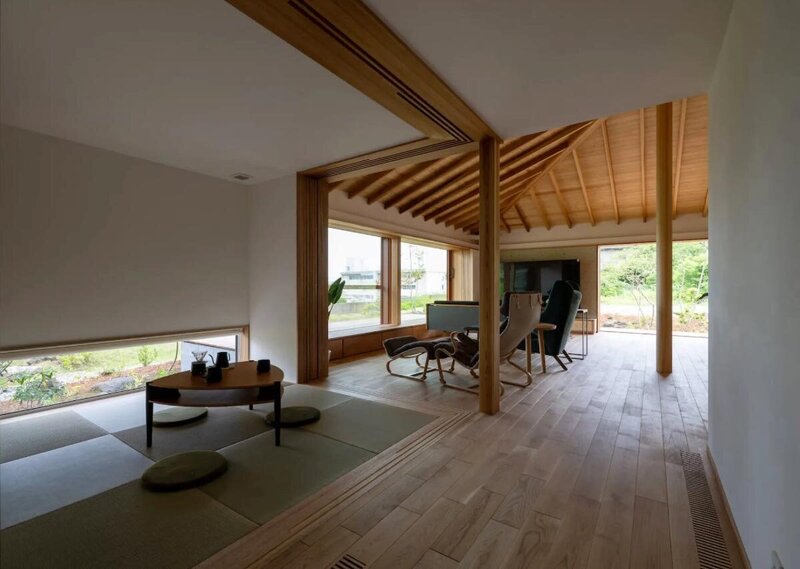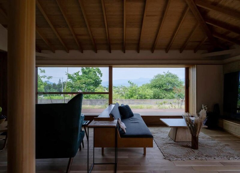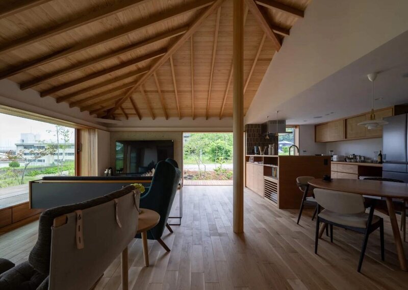 新築、平屋、景色・景観を楽しむ、エクステリアにこだわり、極上のバスタイム、長期優良住宅、断熱等級6、HEAT20 G3、パッシブデザイン、耐震等級3、木製サッシ、トリプルガラス、付加断熱、全館空調、床下エアコン、熱交換換気、C値測定の実施、書斎、アウトドアリビング、ランドリールーム・サンルーム、造作家具・建具、大黒柱・梁の現し、自然素材をふんだんに使用、木造軸組工法、UA値0.24、C値0.4、構造材:山長材(一部集成材使用)、耐震等級3(許容応力度計算)、断熱材:セルロースファイバー、ネオマフォーム、STEICO zell、サッシ:プロファイルウインドー、APW430、建築価格5400万円