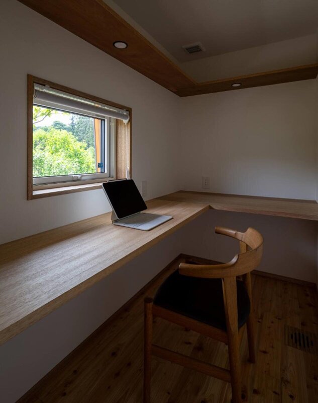 夫婦と子供3人の5人家族のための家は延床面積40坪。南北に長く、遠く東側に群馬県のシンボルである赤城山の山並みを見晴らせる敷地条件を活かせるよう建物の配置を計画。建物を南北に伸びるような形としながら、南側に設けたLDKのメインの開口部を、一般的な南側ではなく眺望の良い東側に向けて大きく開くなど設計の工夫が凝縮している。