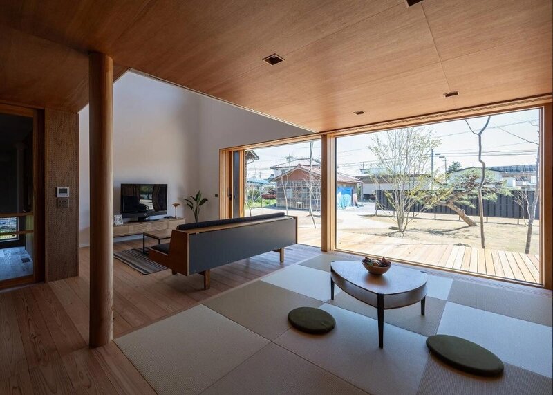 親世帯のリビングは、同じ杉板でも節のある素材をチョイス。天井で高さの揃った、正方形の掃き出し窓が実にシンプル。